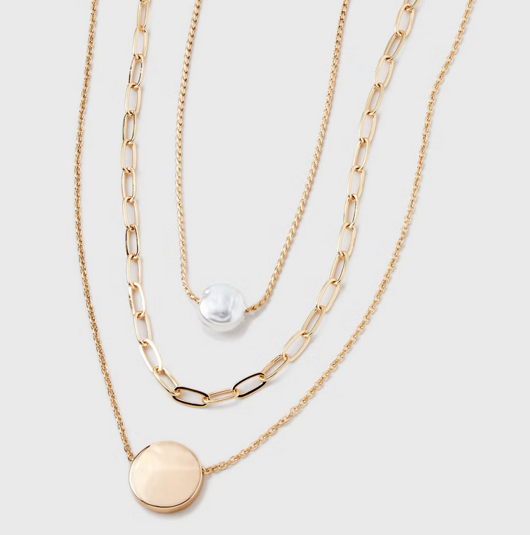 Gold 3 Row With Pearl & Coin Necklace – A New Day™ Gold: Multi-Strand, Nickel-Free Metal, Lobster Claw Clasp, 16″ Length